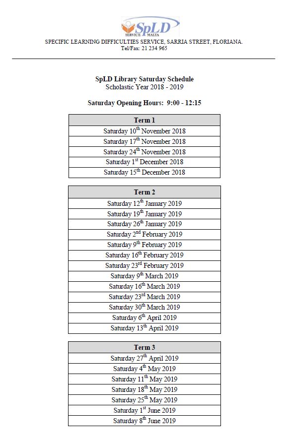 Kindly note that the SpLD library will be open on Saturdays as per the schedule below. Parents of children encountering dyslexic-type difficulties are encouraged to make use of this library which offers a wide variety of reading materials and caters for various reading levels.
