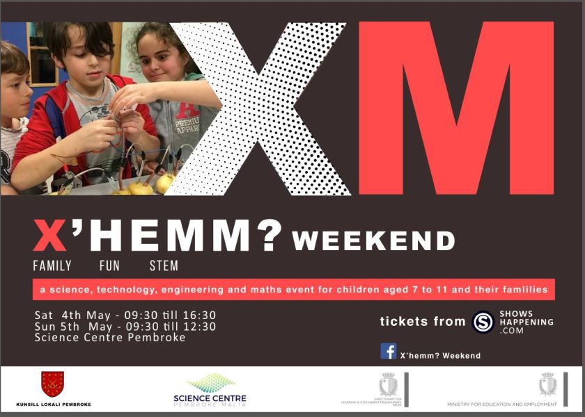 The Directorate for Learning and Assessment Programmes is organizing the first X’hemM? Weekend scheduled for Saturday 4th and Sunday 5th May, at Science Centre, Pembroke. The event targets students in Years 3, 4, 5 and 6 together with their parents/guardians. During the X’hemM? Weekend students accompanied by at least one adult (parent/guardian/relative) can participate in a range of activities/workshops related to Mathematics and Science. The activities/workshops are of a hands-on, enquiry-based nature.