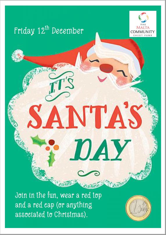 Nhar il-Ħamis, 12 ta’ Diċembru ser ikollna Santa’s Day. Dakinhar, it-tfal jiġu lebsin b’jeans, flokk aħmar u barnuża ħamra (jew xi ħaġa relatat ma’ Father Christmas jew il-Milied). Din l-attivita’ ser issir bħala parti mill-Piggy Bank Campaign b’riżq il-Community Chest Fund, għaldaqshekk nitolbukom biex it-tfal iġibu €1.