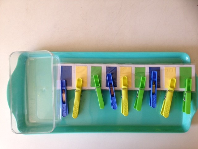 - Create a repeated pattern: attach pegs to cardboard creating a pattern ex. 1 yellow, 1 blue, 1 yellow, 1 blue etc. Ask the child to continue the pattern. Encourage the child to create a pattern himself. You can make it more challenging by increasing colours.