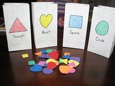 Find some paper bags and draw different shapes on each paper bag. Then cut out different shapes (that match the shapes on the bags) from different kinds of paper.