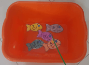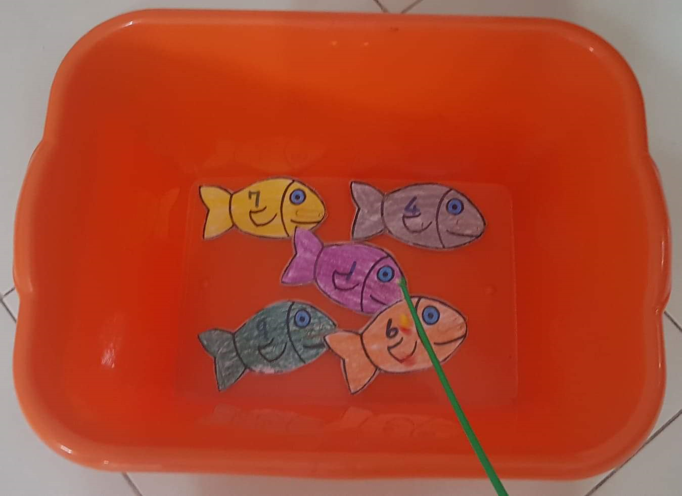 Place the number cards in a container. Then ask the children to try to catch the cards using the rod. This helps to improve their eye-hand co-ordination. Once they catch the card, they have to say the number written on it.