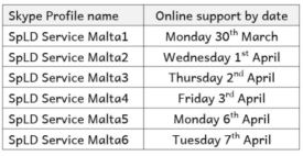 This service will be available on Skype during regular school hours from Monday – Friday between 8:30 – 12:30 and 13:00 – 14:30. Kindly contact SpLD Service Malta on Skype as per attached schedule:
