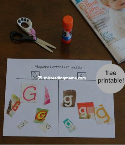 Choose the letter you will be hunting for, e.g. g. Encourage your child to find the letter g from old books and magazines. Cut these letters and paste them on a handout. Sort the higher case letters from the lower case letters