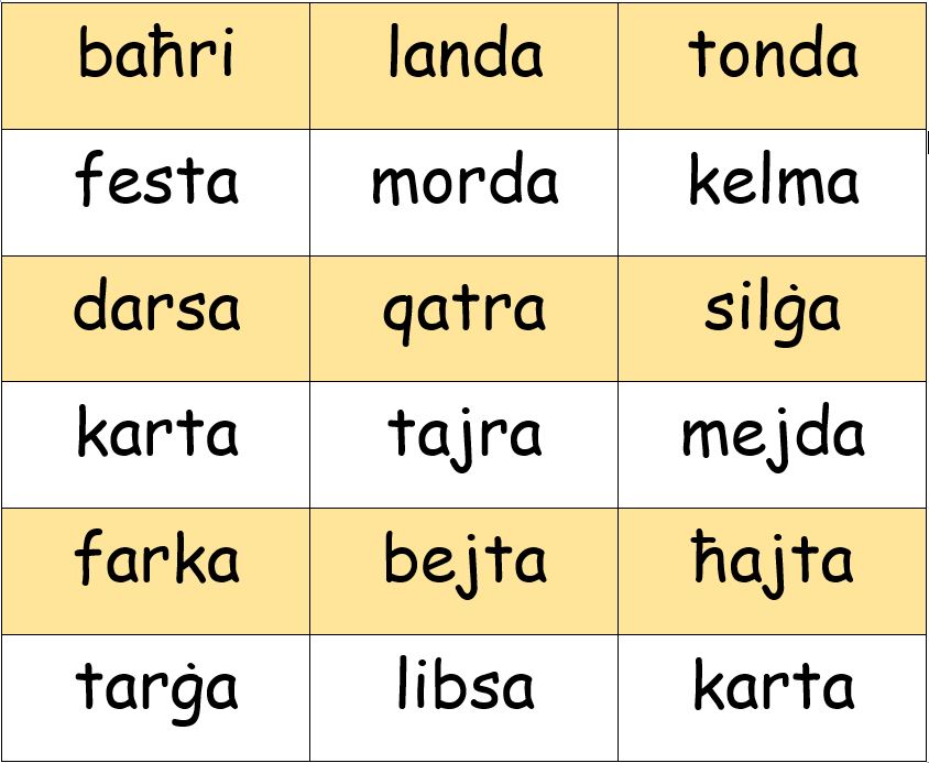 Qed nibgħat din il-lista ta’ kliem biex it-tfal jispelluh u jitgħallmu jaqrawh. Il-kliem huwa kollu tal-istess mudell (kvkkv). Tistgħu tipprintjaw u tqasqsu l-kliem fi flashcards billi tużaw dan il-fajl : lista ta’ kliem