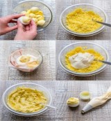 8. Mash everything together until smooth. Transfer the mixture to a bag and pipe generously into the egg bases.