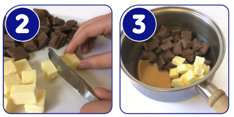 Break the chocolate into chunks and chop the butter into cubes. With the help of an adult, put the chocolate, butter and golden syrup into the saucepan and melt together over a low heat, stirring frequently. Ask the children what they think will happen to the chocolate and butter once you put them on the stove? (They melt because of the heat from the fire).