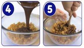 Let the melted chocolate mixture cool for a couple of minutes and then pour over the cornflakes. Mix the chocolate and cornflakes together.