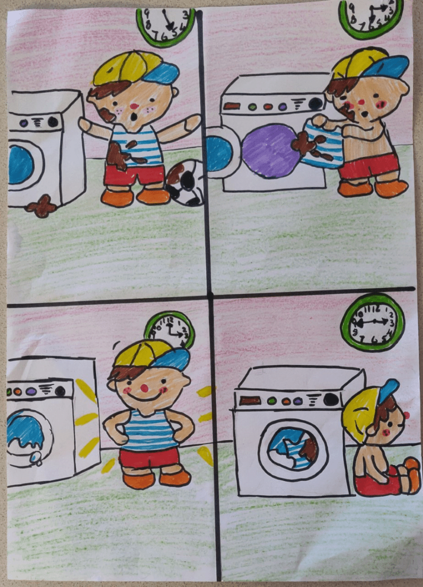 A boy was upset because his t-shirt got dirty. He decided to wash it in the washing machine. He waited patiently for the washing machine to finish. After some time, it was ready. The boy was very happy to wear the clean t-shirt.