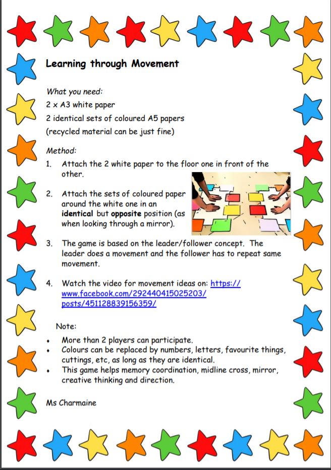 Kindergarten Activity No. 38 – Learning Through Movement use this link below to watch the movement video: