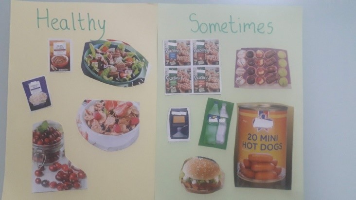- Sort the food pictures into two categories: healthy (food we must eat regularly) and unhealthy (I labelled the unhealthy food ‘sometimes’ to show children it is food we can eat occasionally).