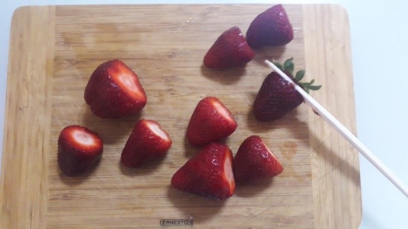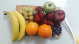 Tip: You can use any fruit that is available at home. The ideal fruits that are soft to cut with a plastic/butter knife are bananas, grapes, strawberries, blueberries and oranges. These fruits vary in colour and have different vitamins.