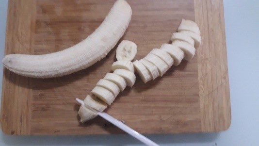 - If using a banana encourage your child to peel the banana skin him/herself and show them the proper way to cut fruit; holding the fruit with one hand while chopping with their dominant hand (the hand they use to hold a colour).