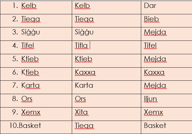 Eż. Għid il-kliem : “kelb – kelb – dar”