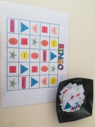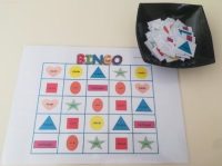 - Give your child the card. S/he must say the name of the shape on the card and then place it on a matching shape on the bingo board.
