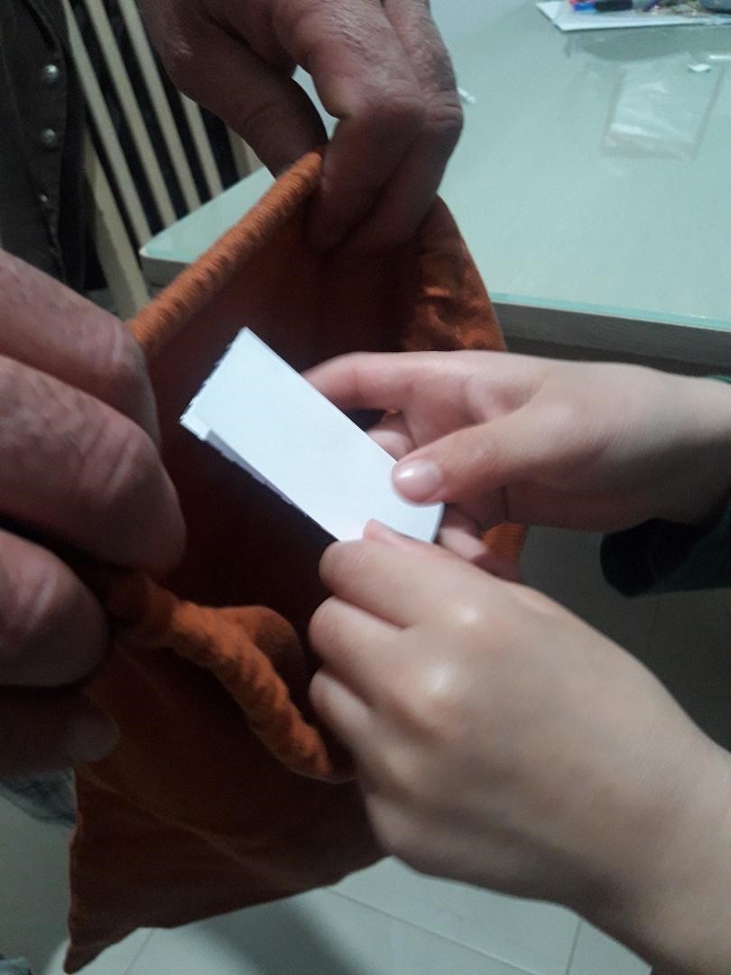 After printing the cards, cut along the dotted line, fold the cards in half and put them in a bowl or in a sack.