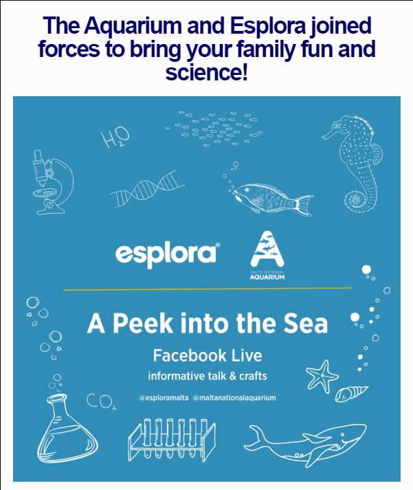 L-Akkwarju Nazzjonali ta’ Malta ingħaqad ma’ Esplora, iċ-Ċentru Interattiv għax-Xjenza, sabiex, permezz tal-Facebook, iwasslulkom ix-xjenza fid-djar tagħkom. Minn mindu laqtitna l-pandemija tal-Coronavirus f’Malta, iż-żewġ ċentri baqgħu għaddejjin b’ħidmiethom fil-qasam tal-komunikazzjoni tax-xjenza. Fil-ġimgħat li ġejjin is-Science Communicators tal-Esplora u l-akkwaristi tal-Akkwarju se joħolqu kontenut immirat għat-tfal u relatat mal-oċejan u l-konservazzjoni.