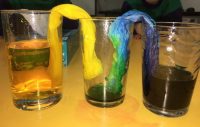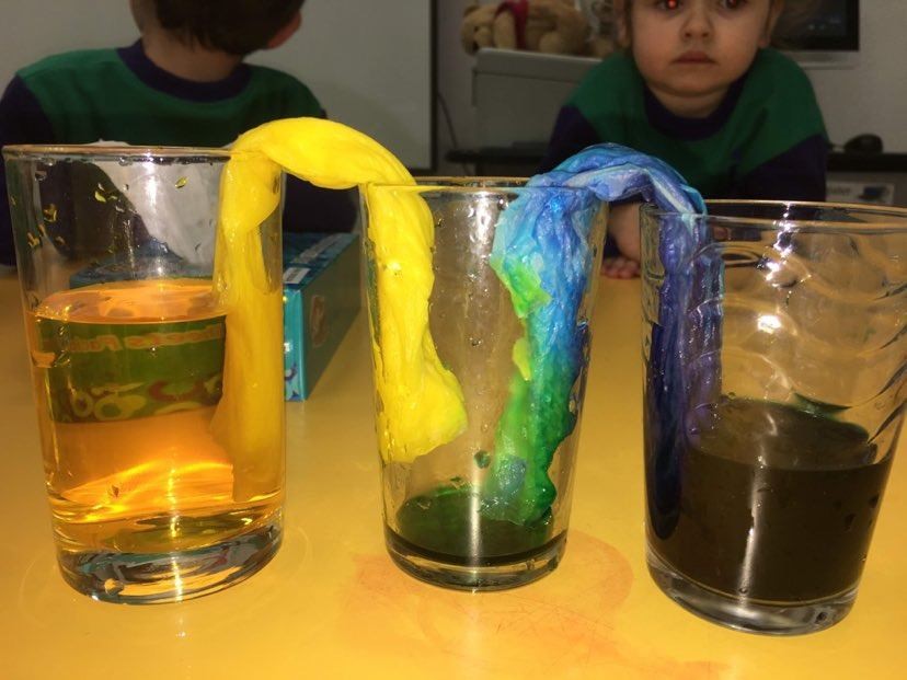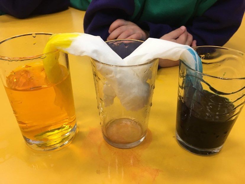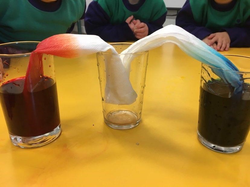 - Watch the paper towel absorbing the coloured water and filling the empty cup.