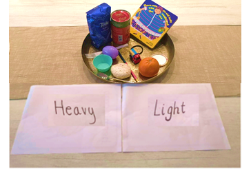 - Start this activity, by discussing with your child the terms “heavy” and “light”, using an example of each.