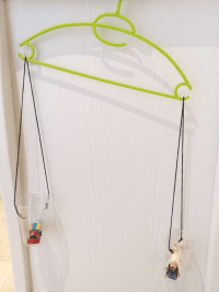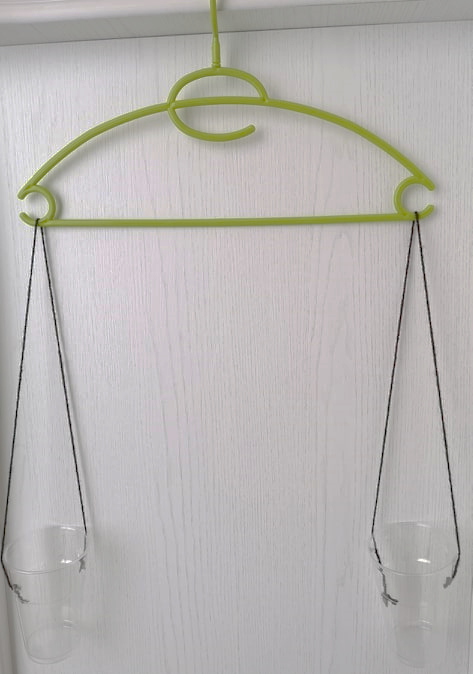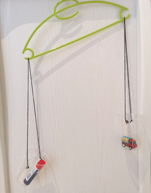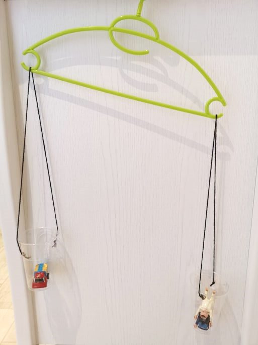 - Encourage your child to balance the hanger to make sure the cups are hanging at the same level. If the strings are not at the same level, adjust the strings until they are even.