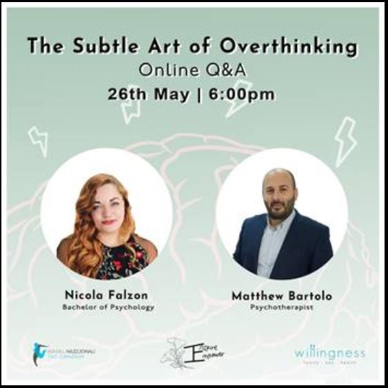For this reason, KNŻ would like to invite you to a Facebook live Q&A ‘The subtle Art of Overthinking’ on Tuesday 26th of May, 6PM. This will be streamed on our Facebook page which you can access here: https://www.facebook.com/KNZMalta/ We aim to answer any questions you might have on the topic, so feel free to fill in the form with your questions: https://forms.gle/3nQBLRkjrQATn25V9. The discussion will be led by trained professionals Matthew Bartolo and Nicola Falzon, from Willingness Team.