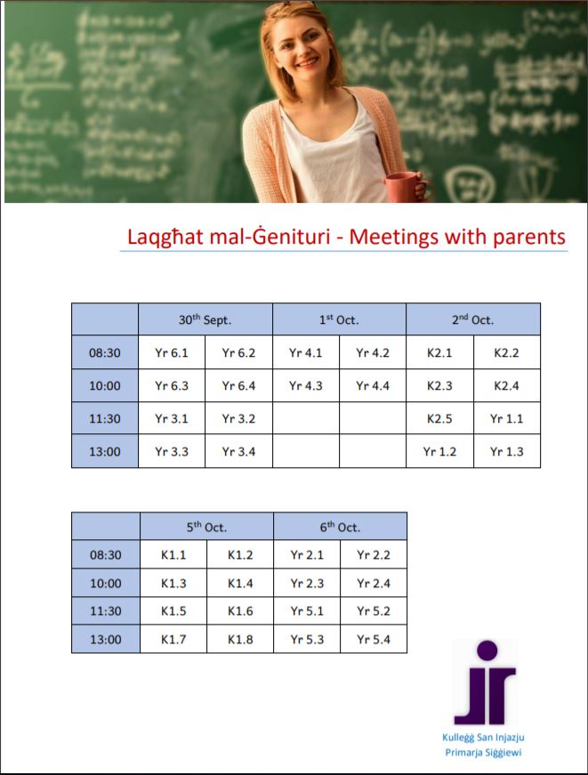 Schedule for online meetings for parents Nhar it-Tnejn ser inkunu qed nibaghtu f’liema klassi ser ikunu t-tfal. On Monday we will be sending you the class your child is in. N Saliba