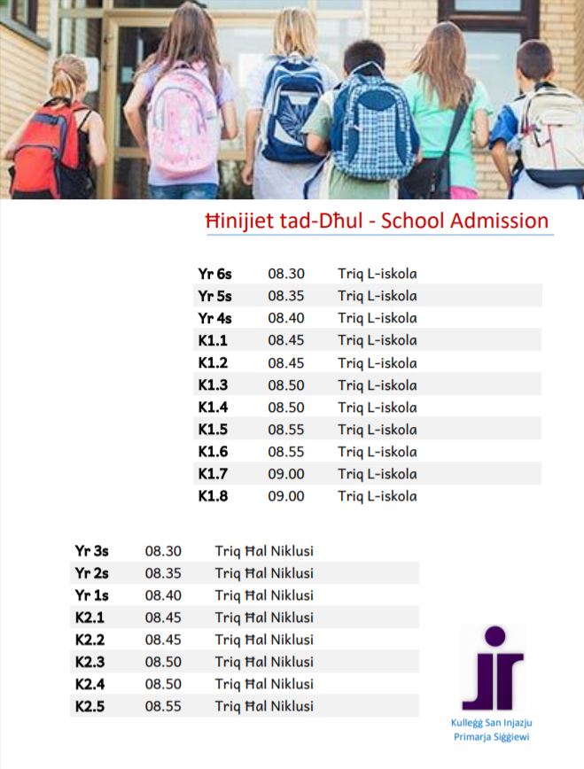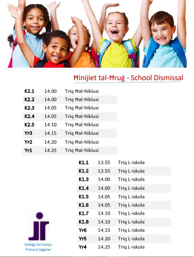 Issa li l-studenti tagħna draw il-proċedura li rridu nimxu magħha, ħassejna li d-dħul u l-ħruġ jista’ ikun aktar mgħaġġel. Għalhekk ippreparajna ħinijiet ġodda għad-dħul fil-għodu u ħruġ mill-iskola wara nofsinhar. Nitolbukom li żżommu mal-ħinijiet li qed nagħtukom sabiex ma jkunx hemm folol ta’ nies jistennew barra ħdejn l-iskola. Importanti ukoll li ġenitur wieħed biss jakkumpanja lit-tfal sal-entratura tal-iskola.