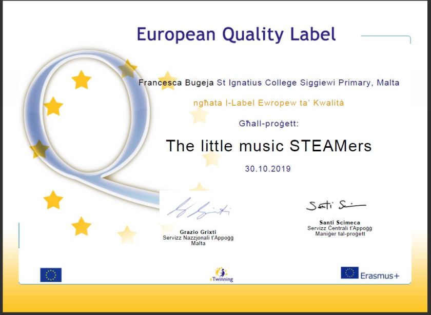 Nifirħu lil Ms Francesca Bugeja l-għaliex l-iskola ingħatat il-Label Ewropea ta’ Kwalità għax-xogħol ta’ kwalità eċċellenti fil-proġett tal-eTwinning bl-isem “The little music STEAMers”. Dan ifisser li x-xogħol tal-għalliema u tal-istudenti ngħata għarfien fl-ogħla livell Ewropew.